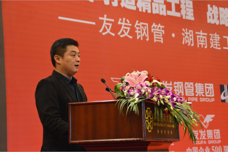 友發(fā)鋼管集團總裁尹九祥在講話中介紹了友發(fā)爭做行業(yè)領跑者、堅持創(chuàng)新整合和對社會高度負責任的公司經(jīng)營理念,并就實力與品牌、產(chǎn)品質(zhì)量、采購價格和整體服務等采購方關心的問題進行了介紹和承諾。他表示,友發(fā)將憑借完善的服務體系和資源,為湖南建工集團打造更多優(yōu)質(zhì)工程做好堅實后盾,友發(fā)也深切希望能與眾多朋友攜手,共同實現(xiàn)互利共贏。